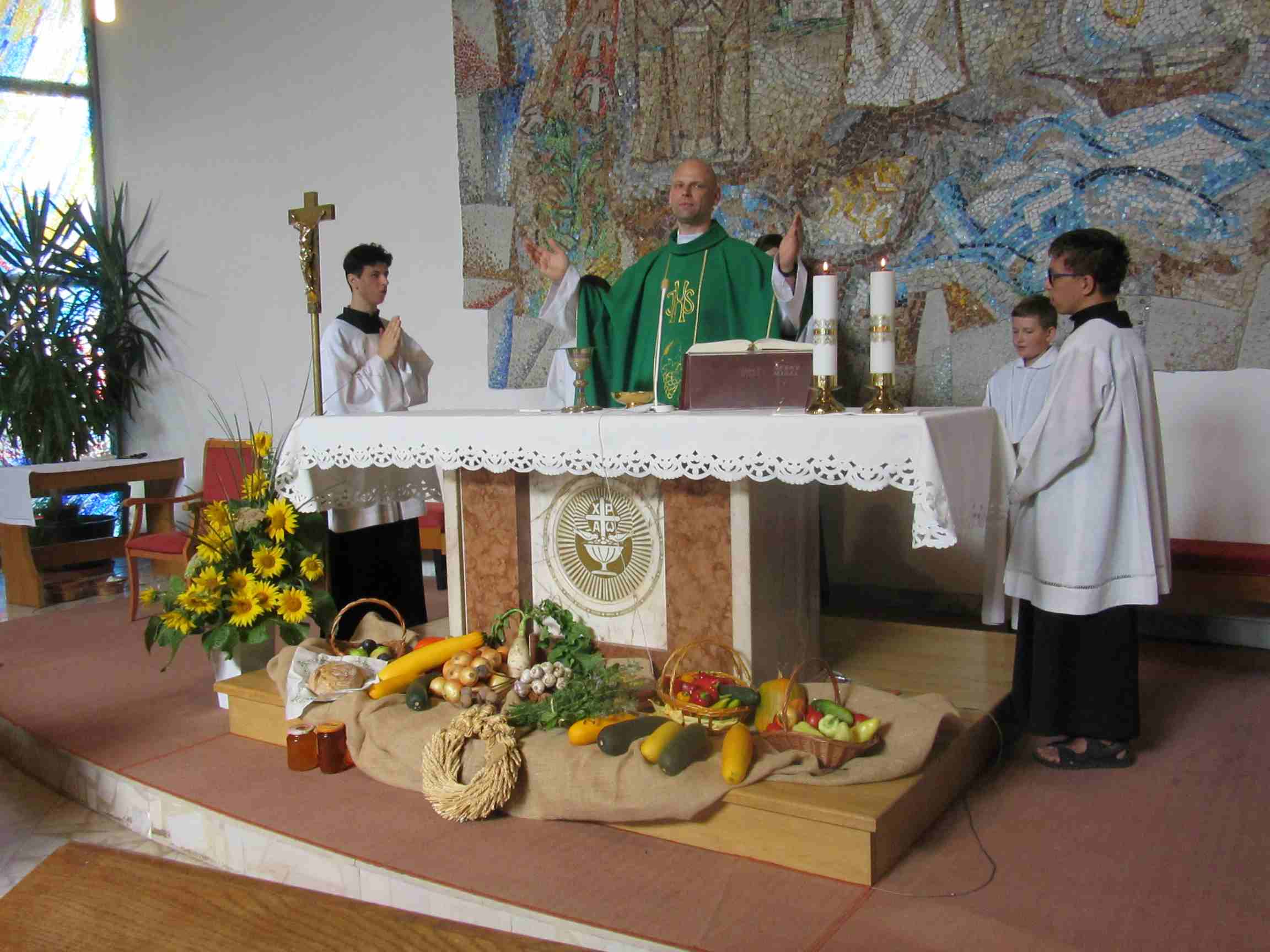 Léto se blíží ke konci a tak jsme při nedělní mši svaté děkovali za úrodu. V obětním průvodu malí i velcí nesli vše, co se urodilo na zahradách a polích.